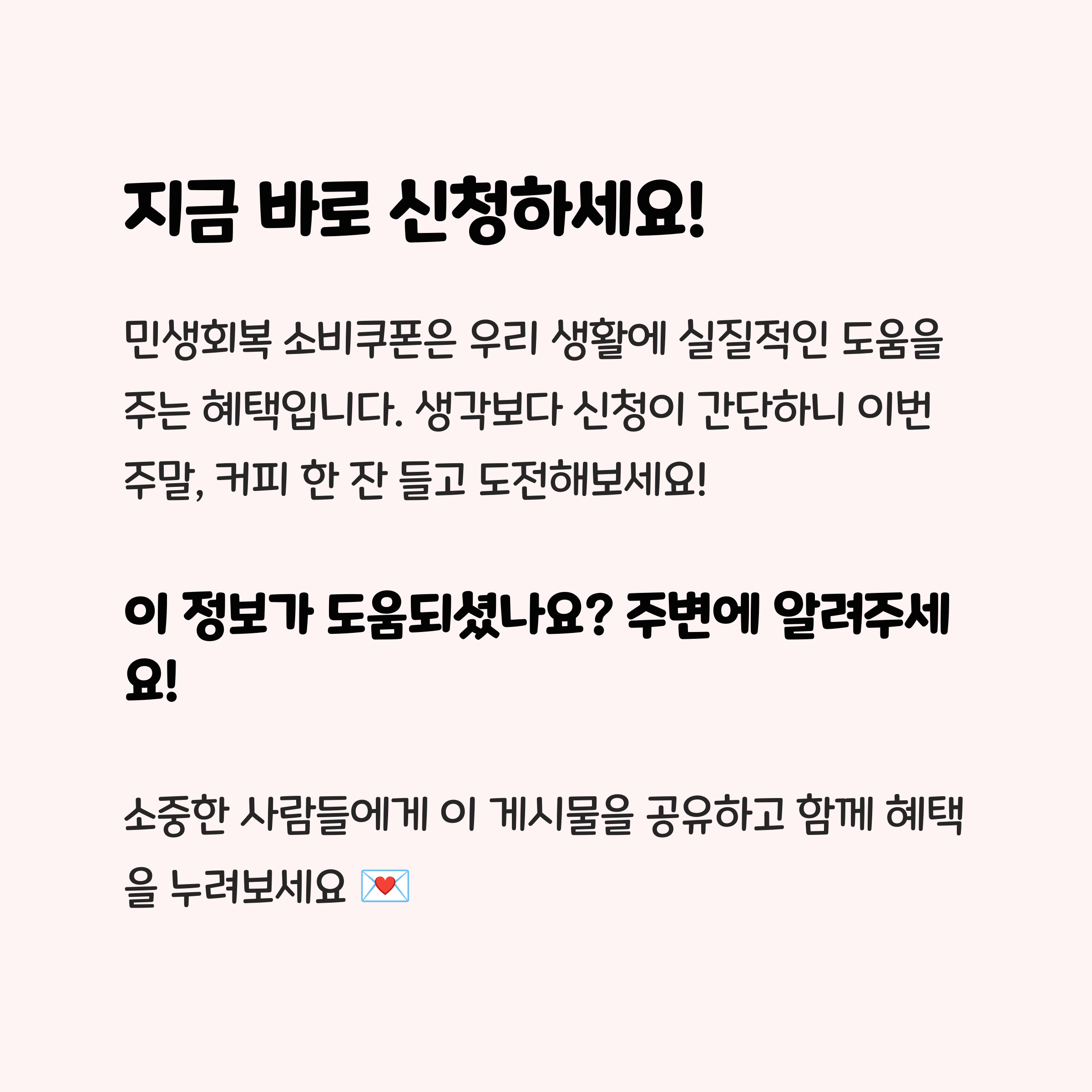여러분, 민생회복 소비쿠폰이라는 제도는 단순한 지원금이 아니라, 우리의 생활에 직접적인 도움을 줄 수 있는 진짜 실속 혜택이에요. 복잡해 보일 수도 있지만 막상 해보면 정말 간단하고요. 저는 이 글을 쓰면서 다시 한 번 "정보가 곧 돈이다"라는 걸 절실히 느꼈어요. 혹시 아직 신청 안 하셨다면 이번 주말에 커피 한 잔 들고 신청 한번 해보시는 건 어때요? 생각보다 빠르고 간단하답니다. 앞으로도 이런 꿀정보 놓치지 않도록 계속 업데이트 드릴게요. 우리 같이 알차게 챙겨봅시다!
