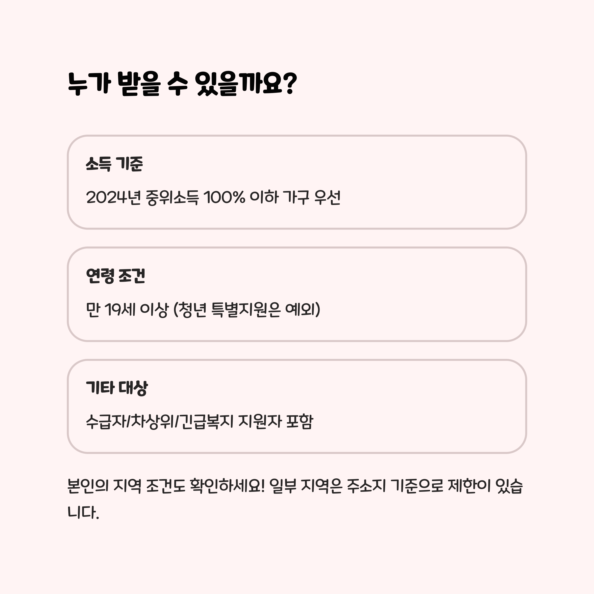 | 소득 기준 | 2024년 중위소득 100% 이하 가구 우선 |