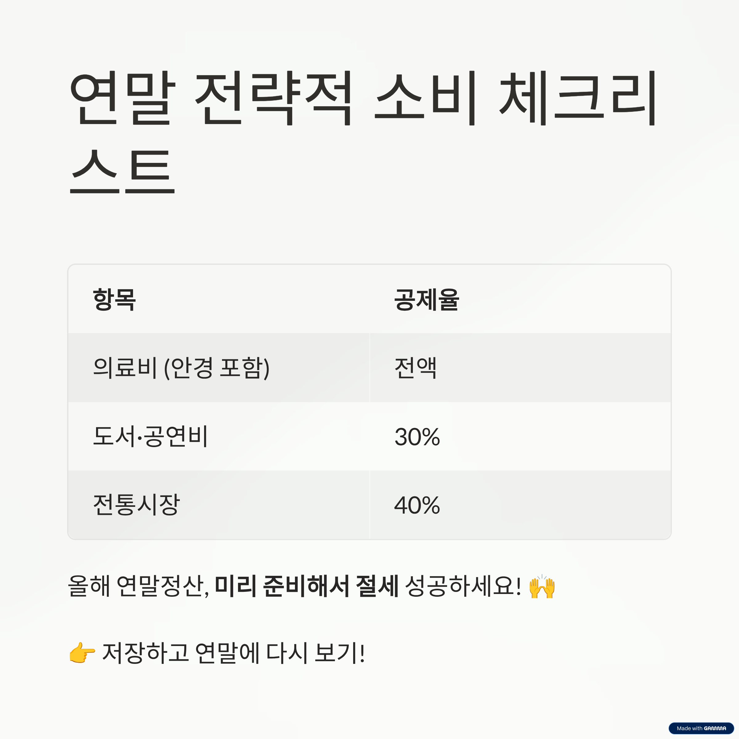 연말정산은 미리 준비할수록 유리한 제도입니다. 특히 올해처럼 공제 항목이 다양하고 바뀐 부분이 많을 땐, 꼼꼼한 체크가 필수예요. 이 글에 담은 절세 전략들이 여러분의 연말정산을 든든하게 만들어줄 수 있기를 바랍니다. 괜히 ‘내 돈 놓고 내가 못 찾는’ 일 없도록, 우리 모두 똑똑하게 챙겨보자고요. 올해는 꼭, 기분 좋은 환급 받으시길 응원합니다!
