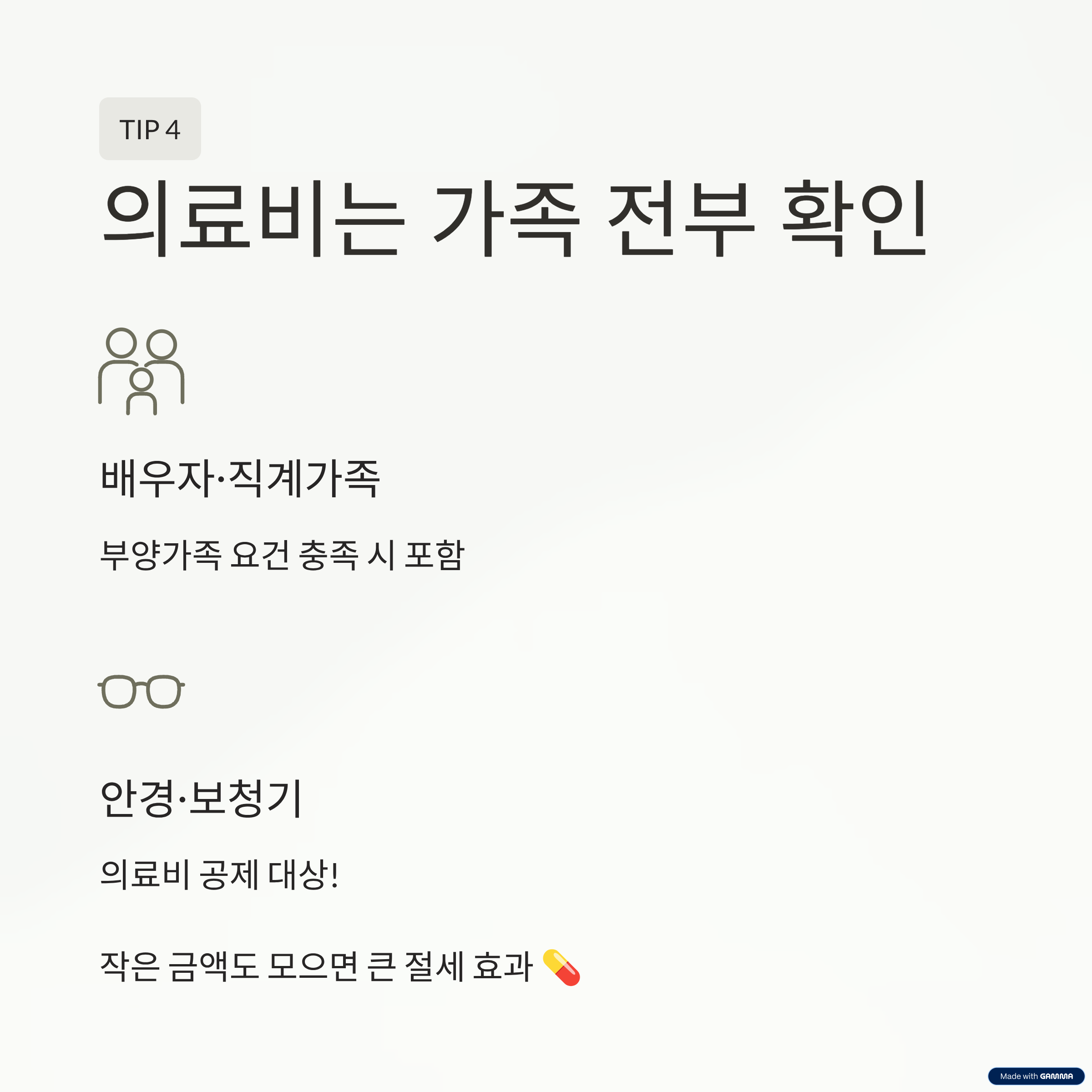 의료비 공제는 본인만 해당되는 게 아니에요. 배우자, 부모님, 자녀, 형제자매 등 부양가족까지 공제 대상이 되죠. 단, 인적공제를 받은 가족이어야 가능하니, 사전에 등록 여부를 꼭 확인하셔야 합니다. 안경, 보청기, 장애인 보장구 등도 포함돼서 빠지기 쉬운 지출도 잘 챙겨보세요!