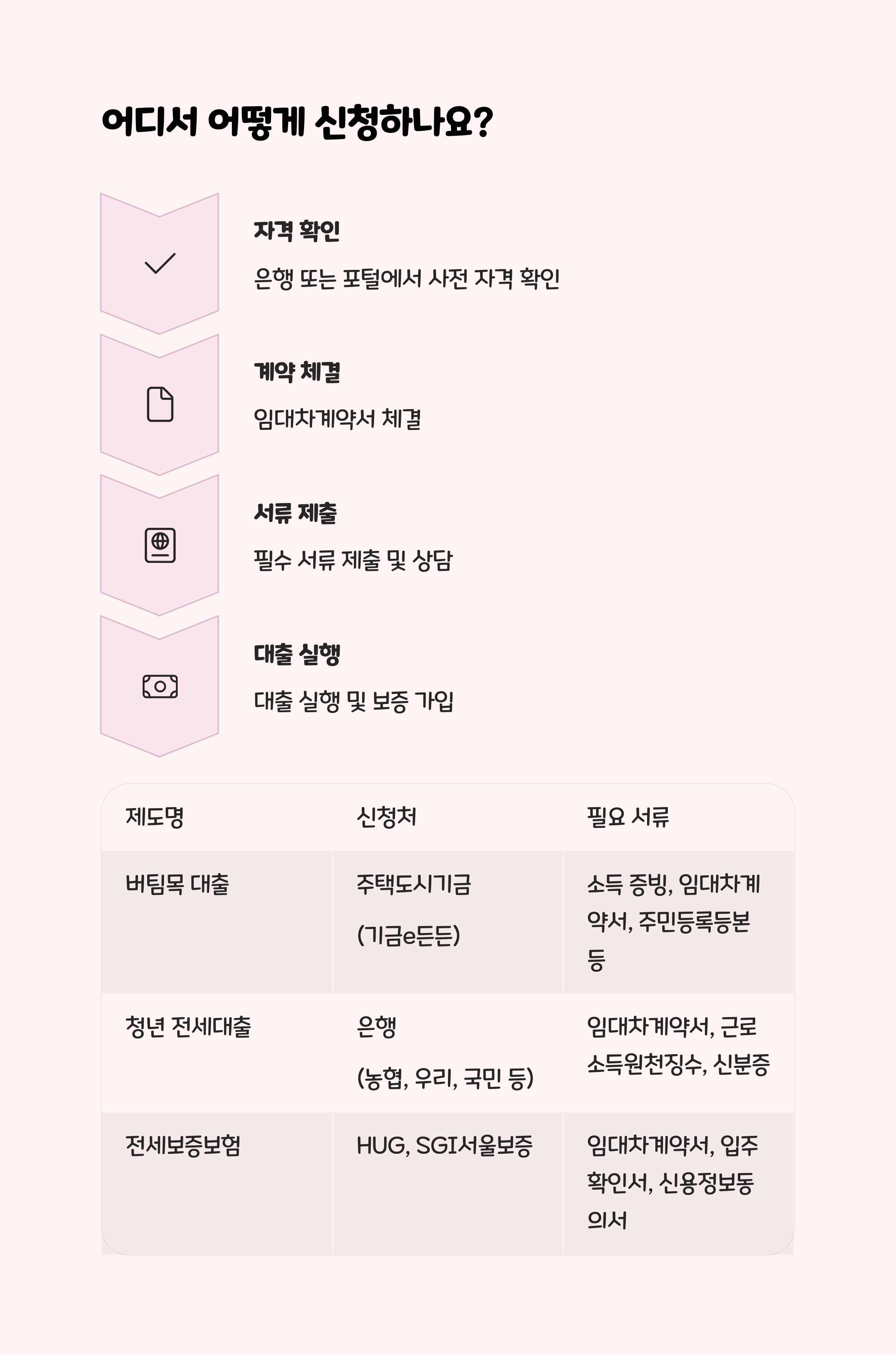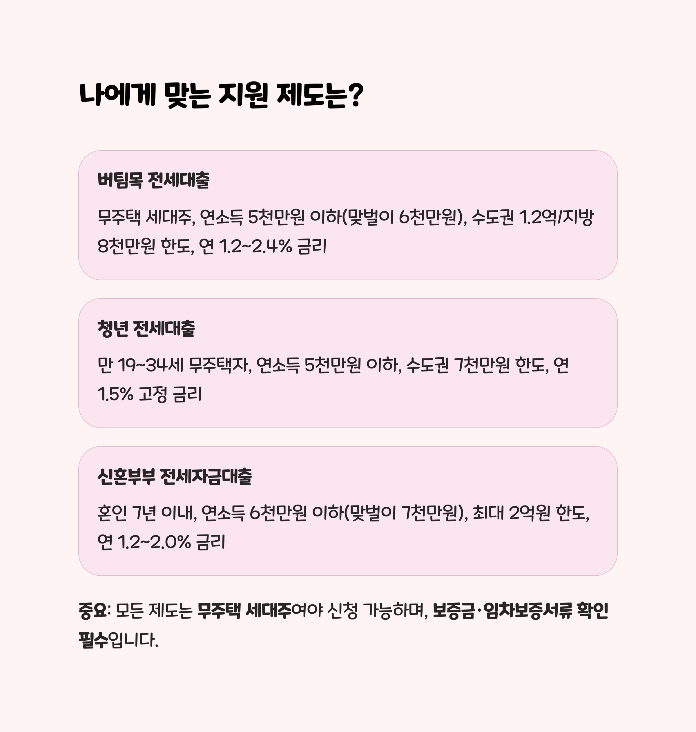 중요: 모든 제도는 무주택 세대주여야 신청 가능하며, 보증금·임차보증서류 확인 필수입니다.