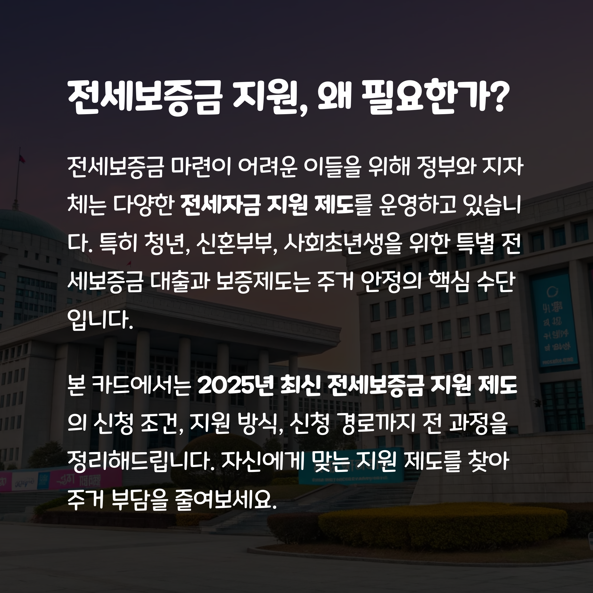 본 글에서는 2025년 최신 전세보증금 지원 제도의 신청 조건, 지원 방식, 신청 경로까지 전 과정을 정리해드립니다.