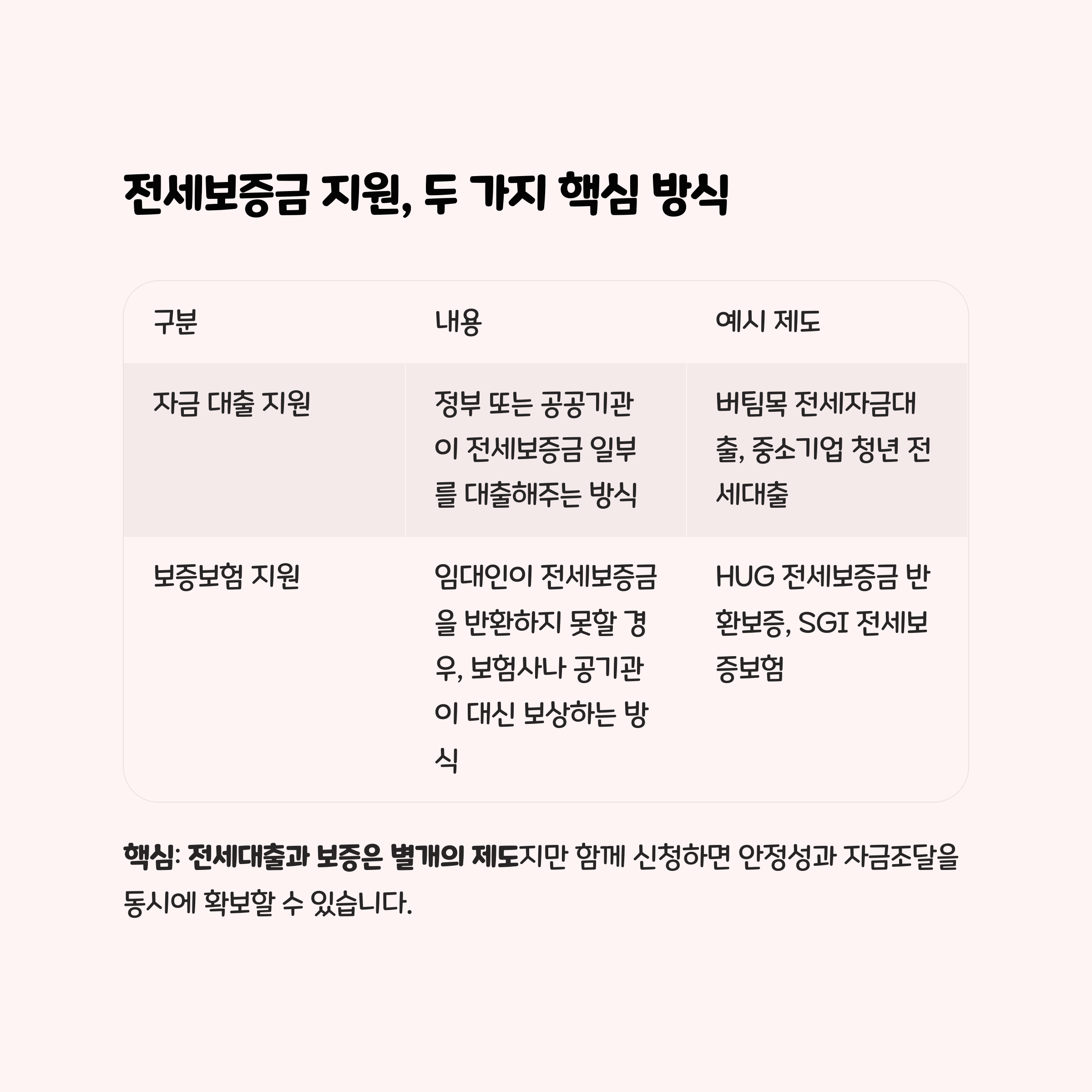 | 보증보험 지원 | 임대인이 전세보증금을 반환하지 못할 경우, 보험사나 공기관이 대신 보상하는 방식 | HUG 전세보증금 반환보증, SGI 전세보증보험 |