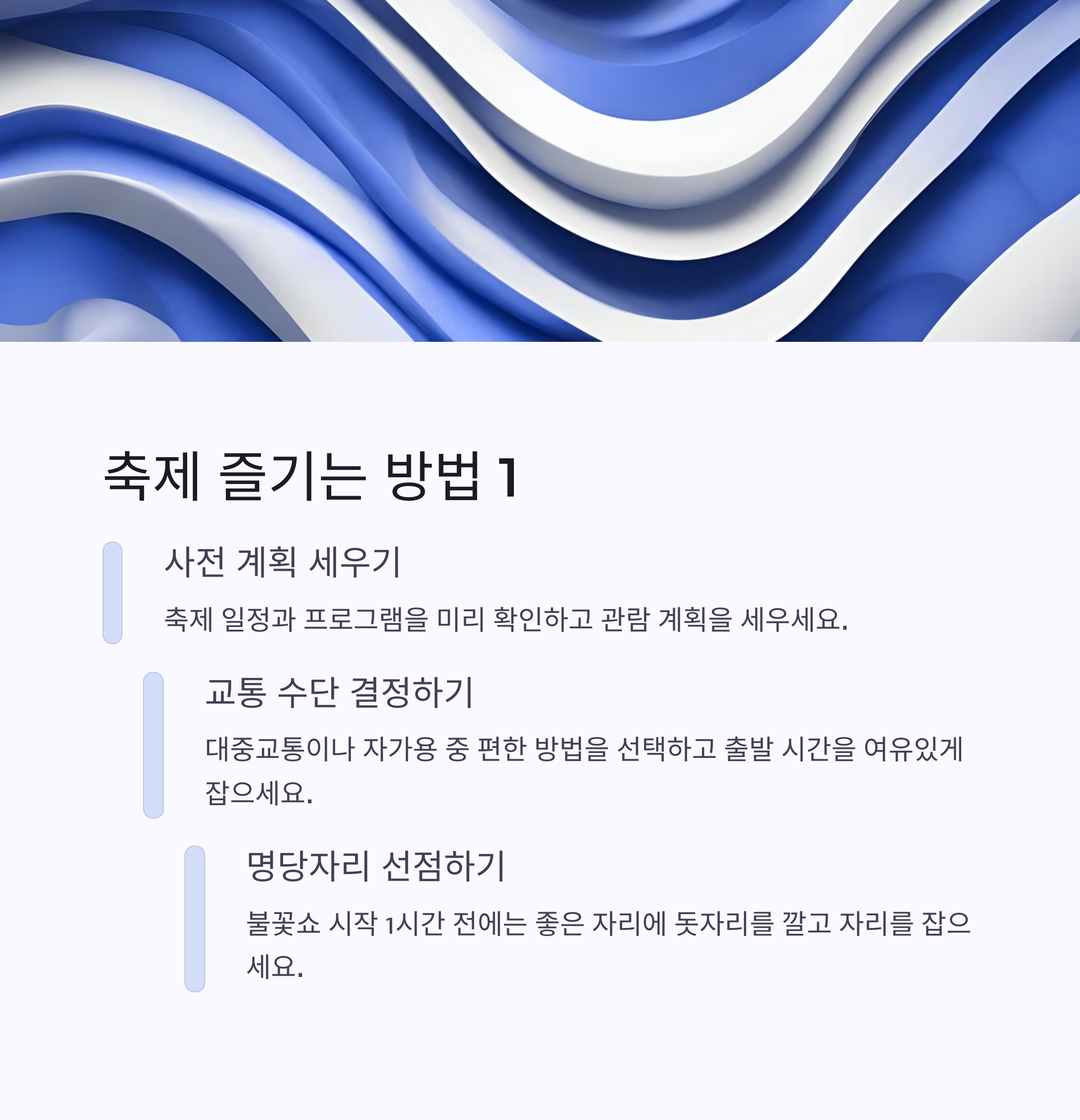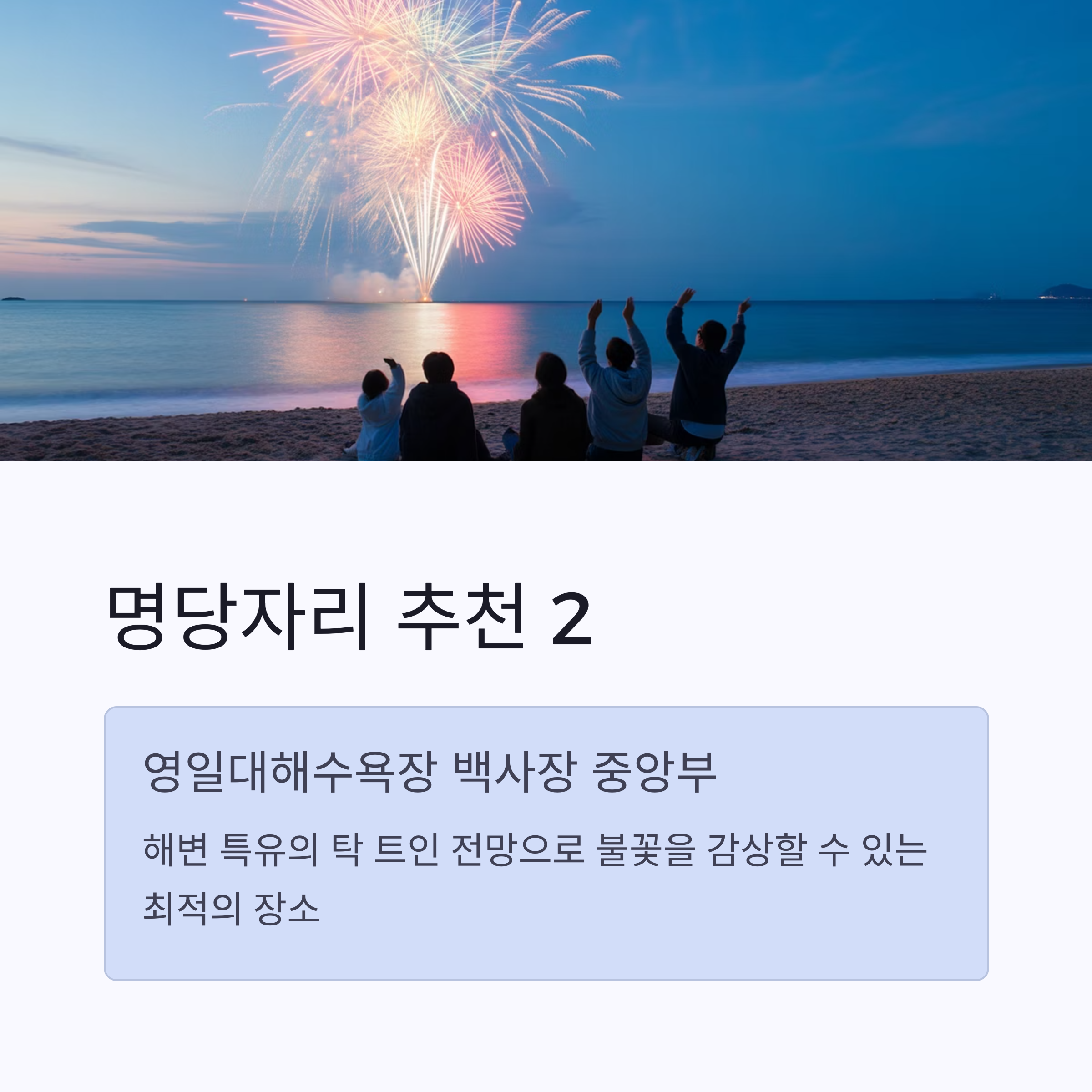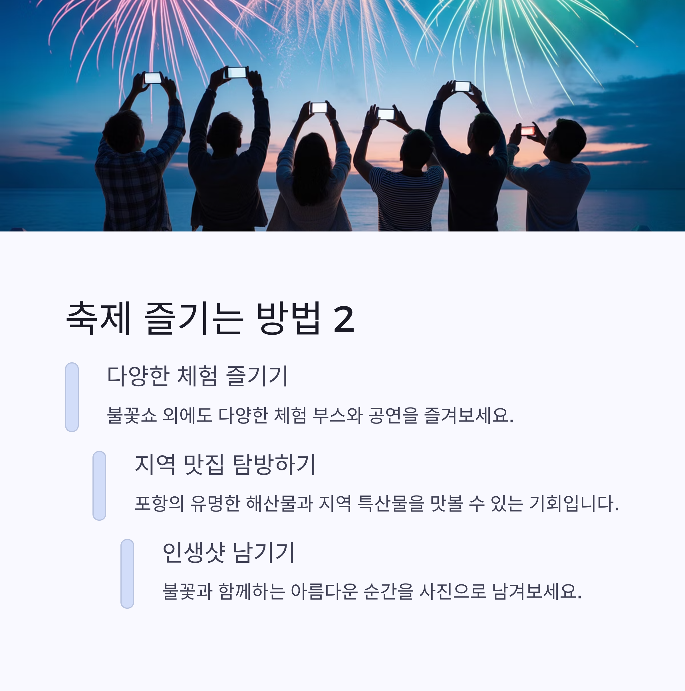 2025년 여름, 포항국제불빛축제는 그 어느 때보다도 다채로운 불빛과 문화, 감동으로 가득할 예정입니다. 가족과 연인, 친구들과 함께 밤하늘을 수놓는 불꽃을 보며 올여름의 가장 빛나는 순간을 만들어보세요. 축제에 대한 여러분의 경험이나 꿀팁도 댓글로 함께 나눠주세요. 당신의 이야기가 또 다른 여행자의 지도가 될 수 있답니다 :)