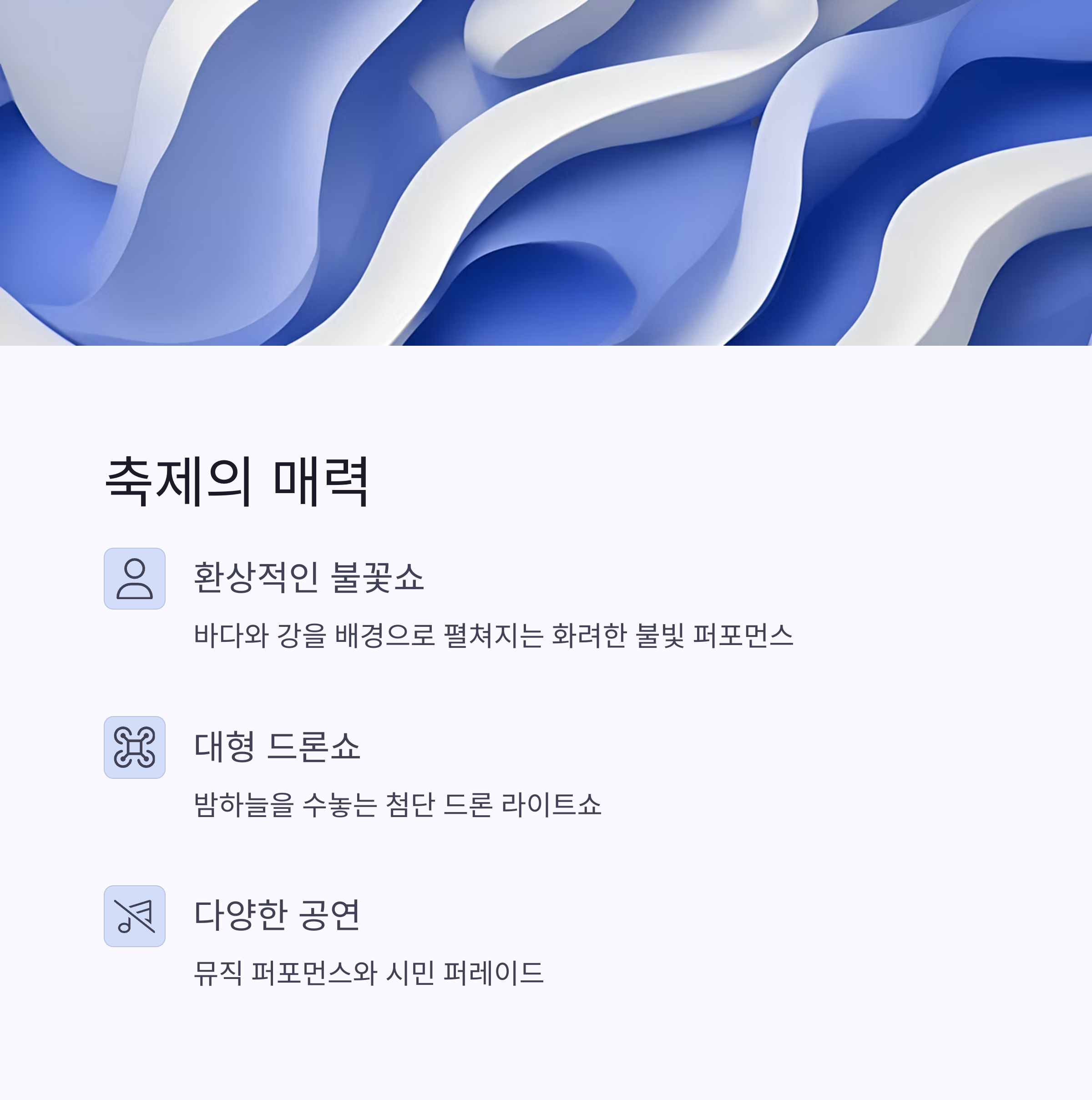 주요 프로그램 | 국제 불꽃쇼, 드론 라이트쇼, 뮤직 퍼포먼스, 시민 퍼레이드, 푸드트럭존, 어린이 체험부스 등 |