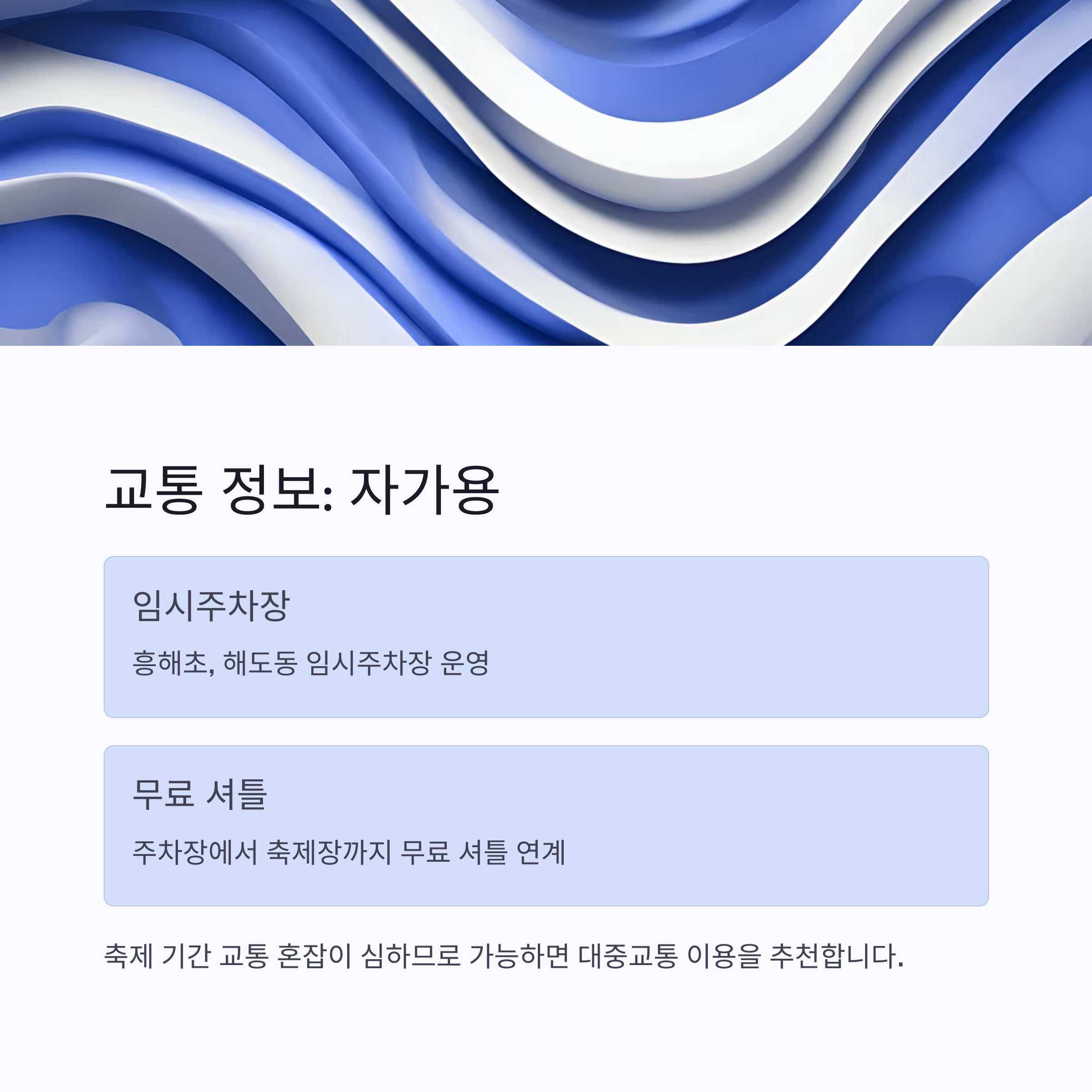 축제 기간 동안 포항시는 교통 혼잡을 줄이기 위해 다양한 교통 대책을 운영합니다. 주요 장소에는 셔틀버스가 운영되며, 임시 주차장도 마련되어 있어요.