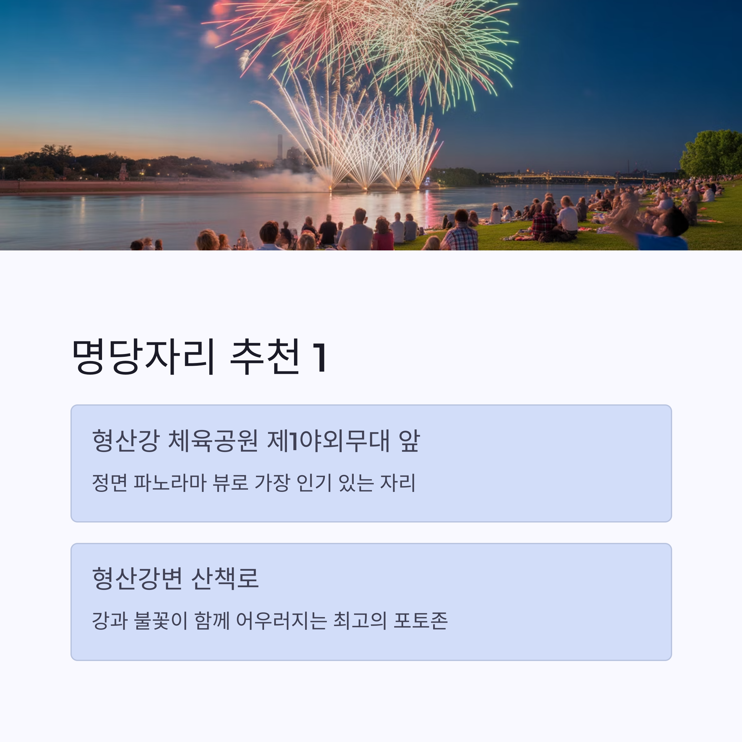 불꽃놀이를 제대로 즐기려면 명당은 필수죠! 포항국제불빛축제의 불꽃쇼는 형산강 체육공원과 영일대 해수욕장에서 진행되기 때문에, 명당 자리를 사전에 알고 가면 더 좋은 뷰로 관람할 수 있어요.