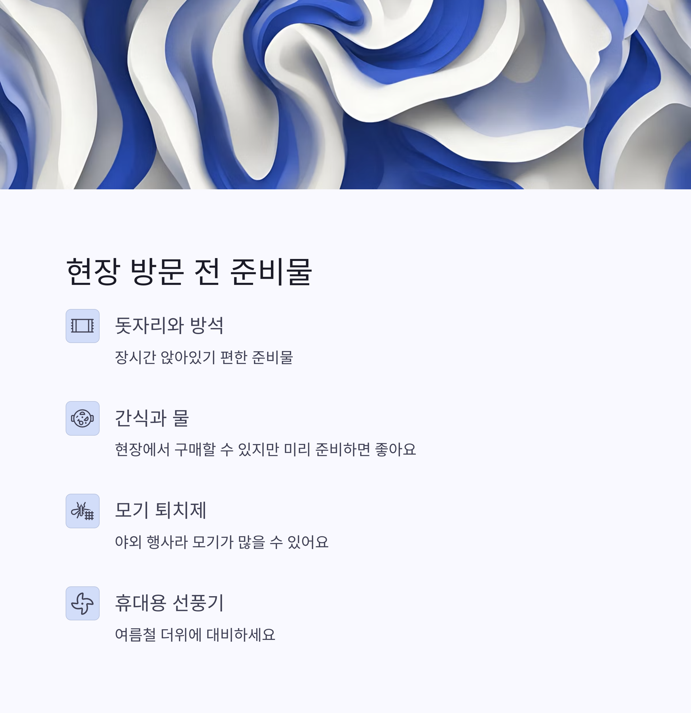- 돗자리, 방석, 간식은 필수! 편하게 관람할 수 있어요.