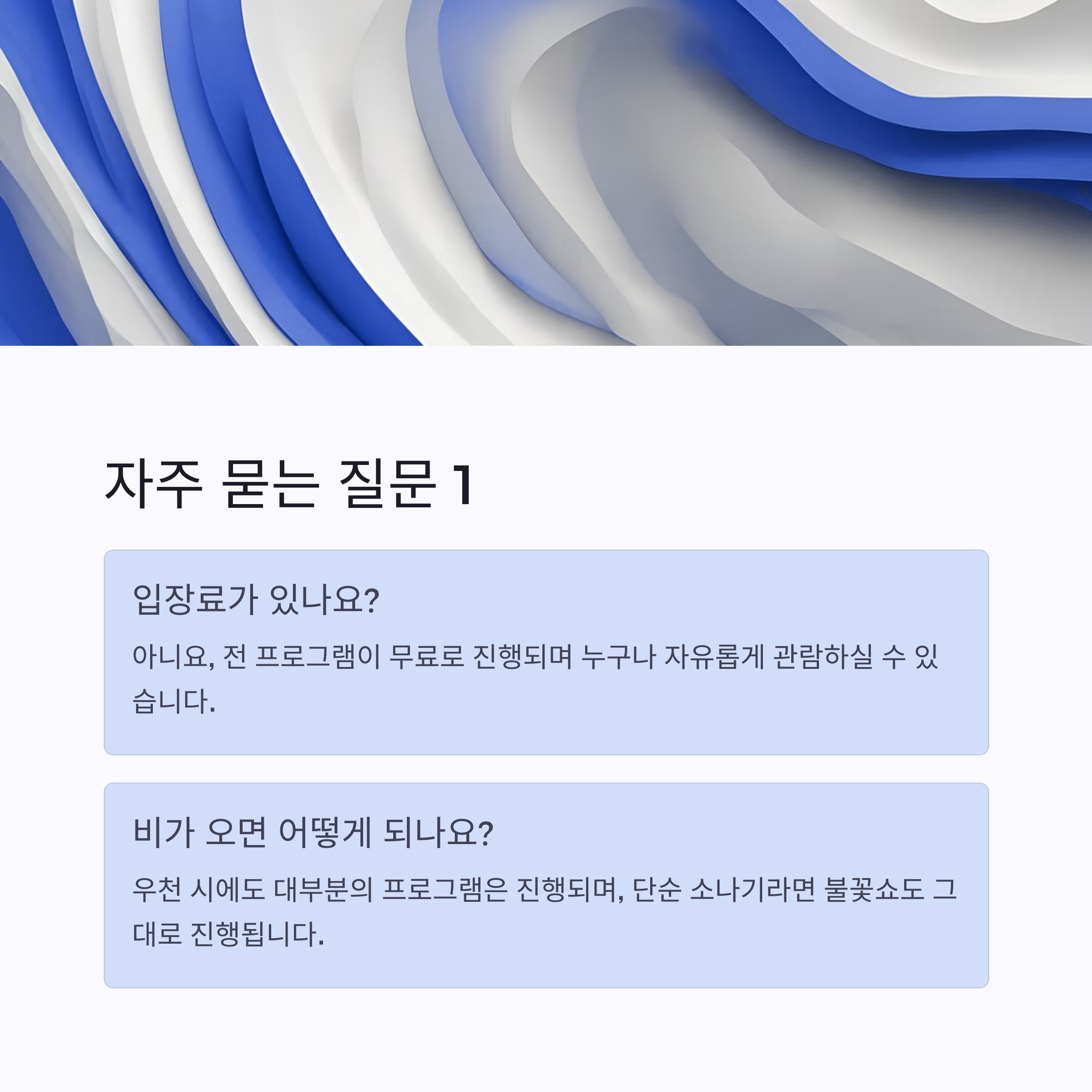 우천 시에도 대부분의 프로그램은 진행되며, 단순 소나기라면 불꽃쇼도 그대로 진행됩니다. 다만 폭우 시엔 일부 일정이 변경될 수 있어요.