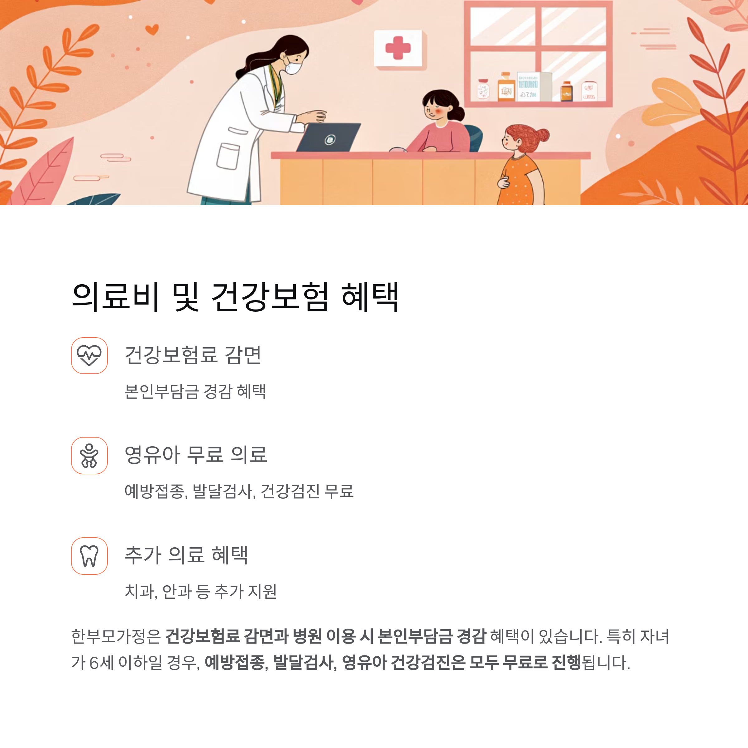 한부모가정은 건강보험료 감면과 병원 이용 시 본인부담금 경감 혜택이 있습니다.