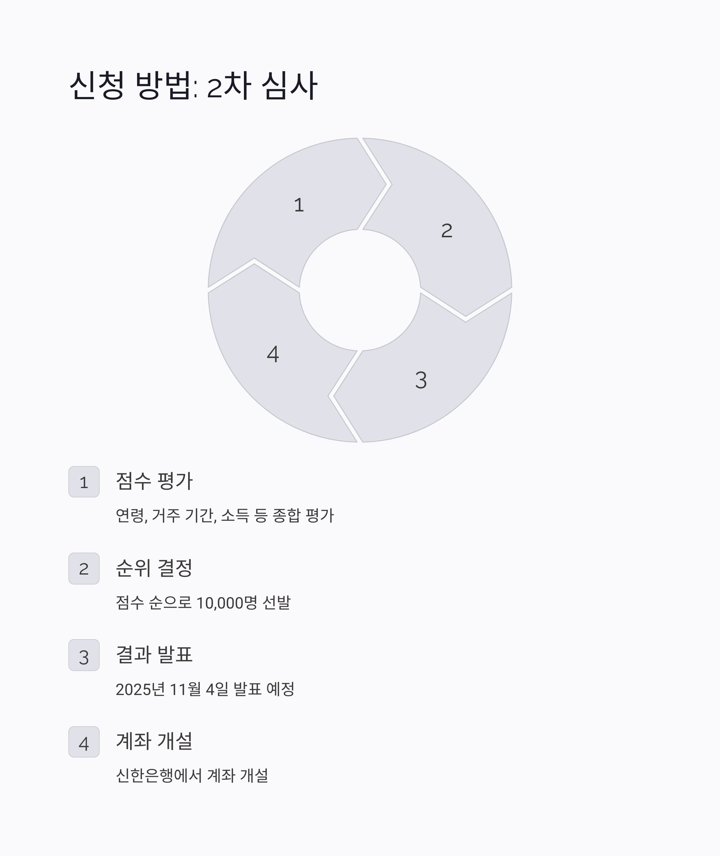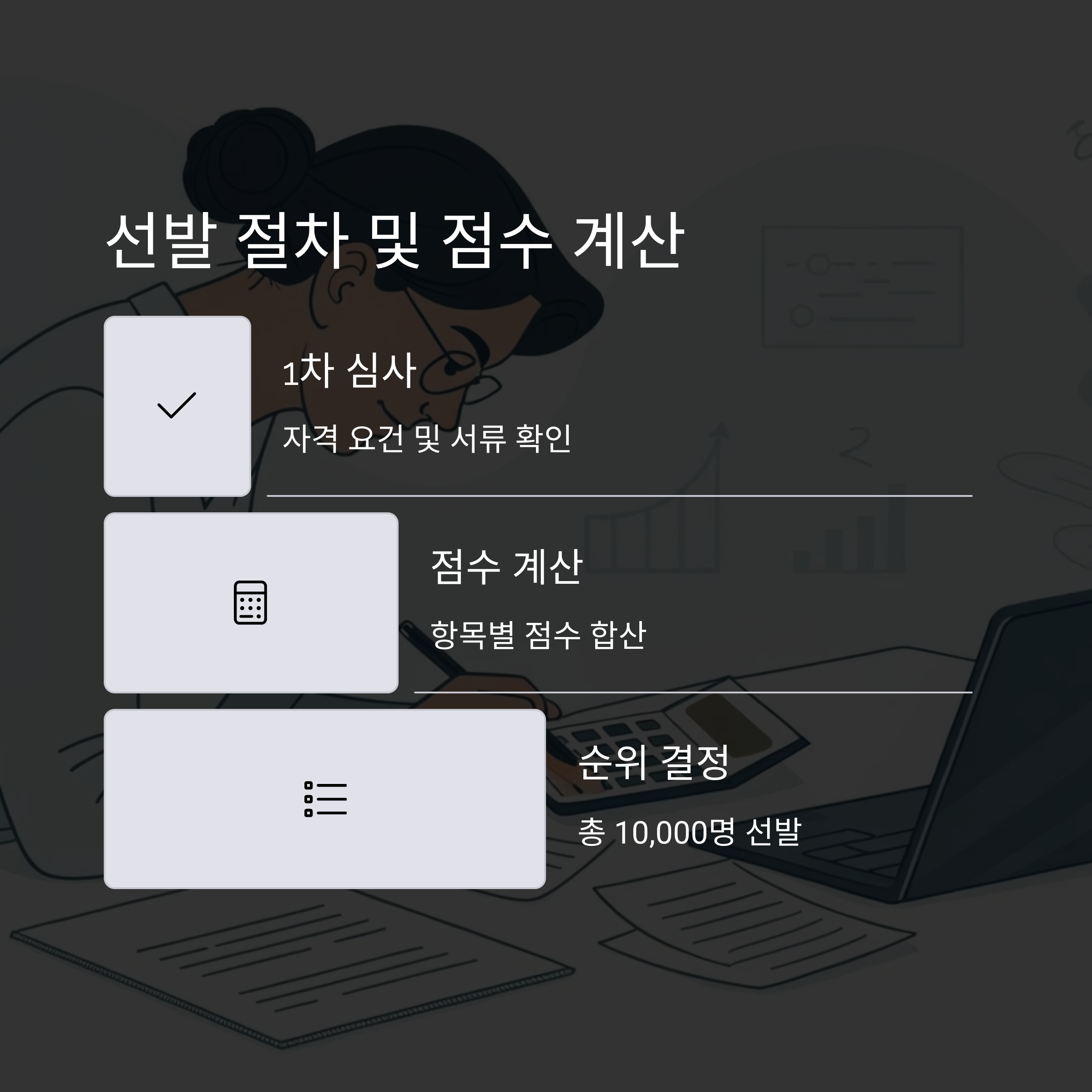 1차 심사에서 자격 요건과 서류를 확인하고, 2차 심사에서 점수 순으로 10,000명을 선발해요.