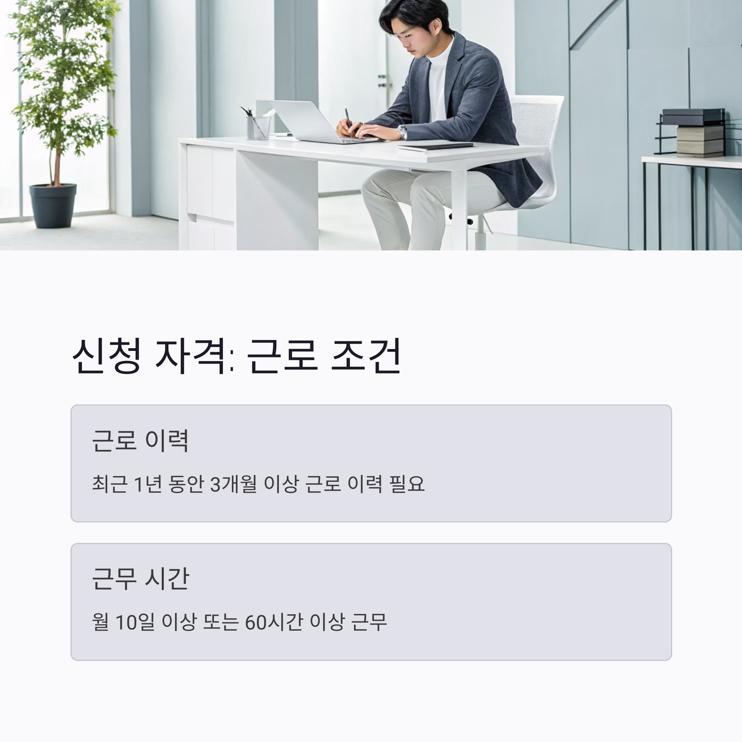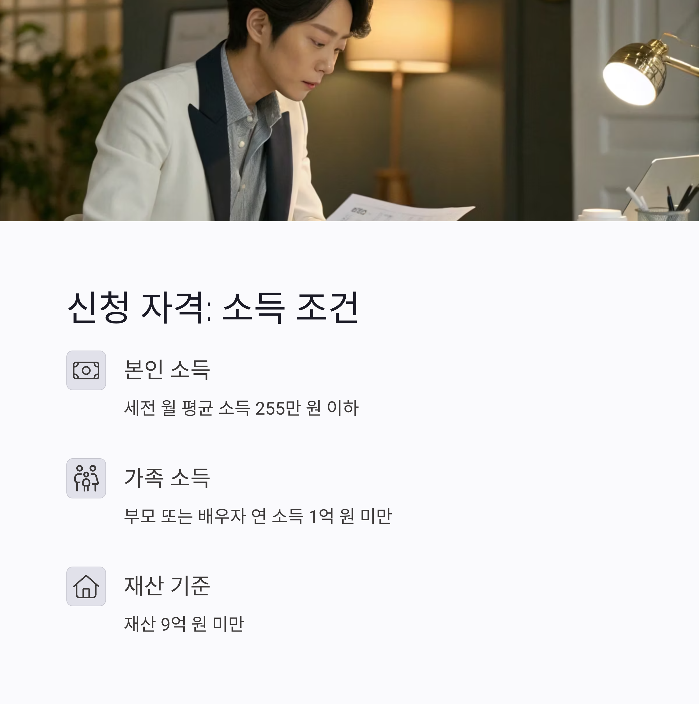 최근 1년 동안 3개월 이상 근로 이력이 필요해요. 월 10일 이상 또는 60시간 이상 근무하면 인정돼요. 세전 월 평균 소득 255만 원 이하, 부모 또는 배우자 연 소득 1억 원 미만, 재산 9억 원 미만 조건도 충족해야 해요.
