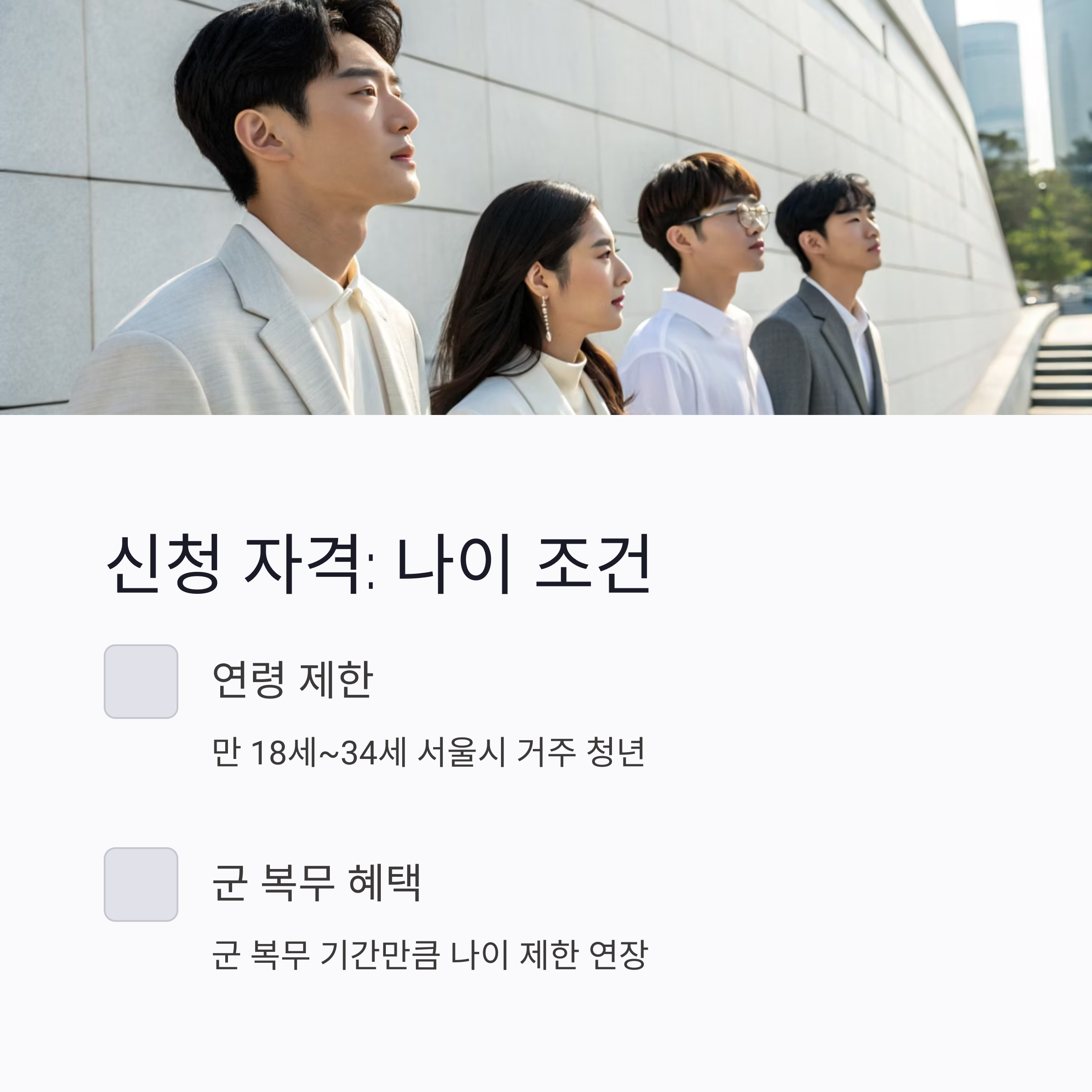 만 18세~34세 서울시 거주 청년이라면 주목하세요! 군 복무 기간만큼 나이 제한이 늘어나는 점도 잊지 마세요. 소득과 근로 조건도 중요한데요, 자세히 알아볼까요?