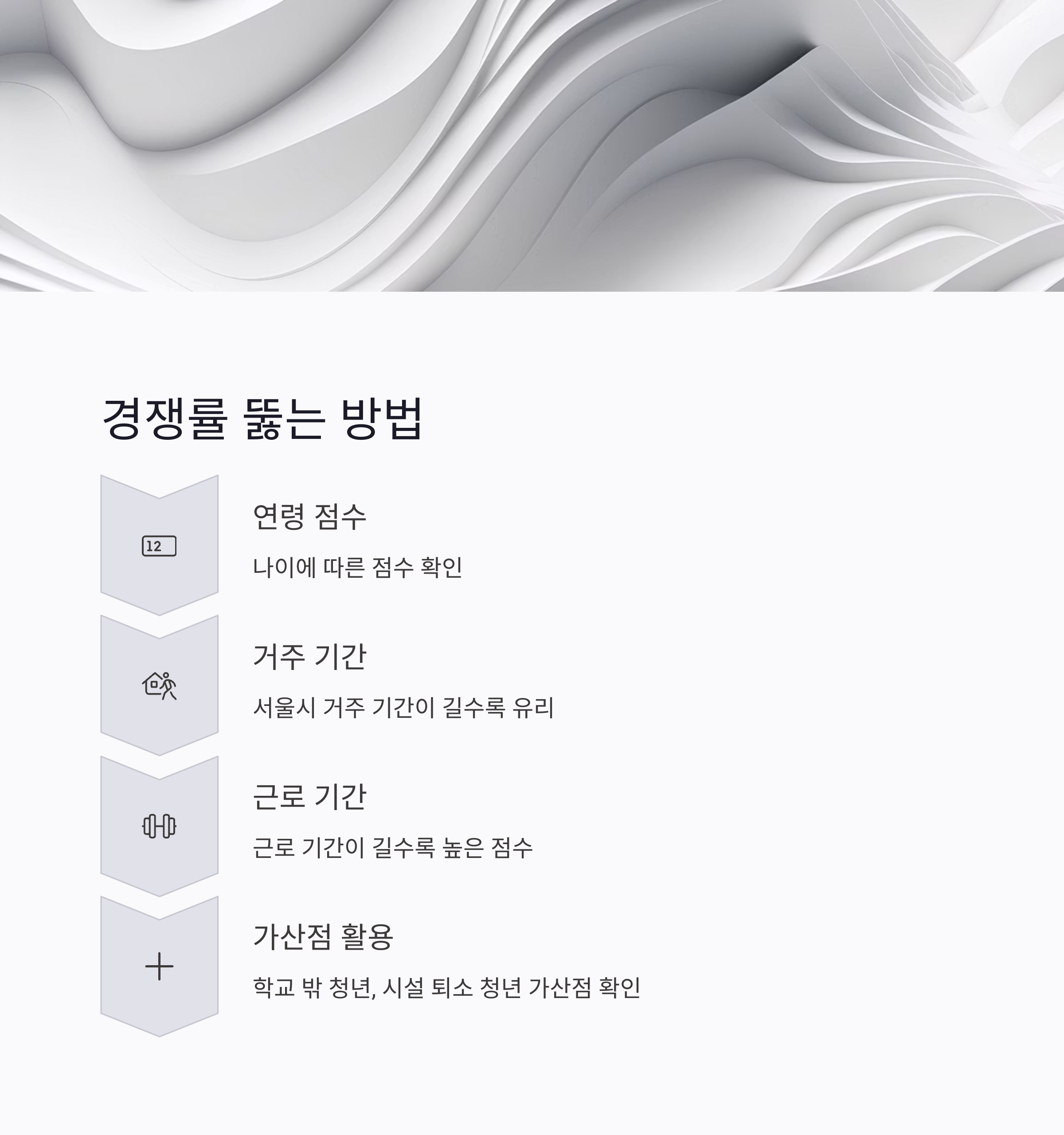 자격 요건을 통과한 사람 중 점수순 선발! 가산점 항목을 꼭 챙기세요.