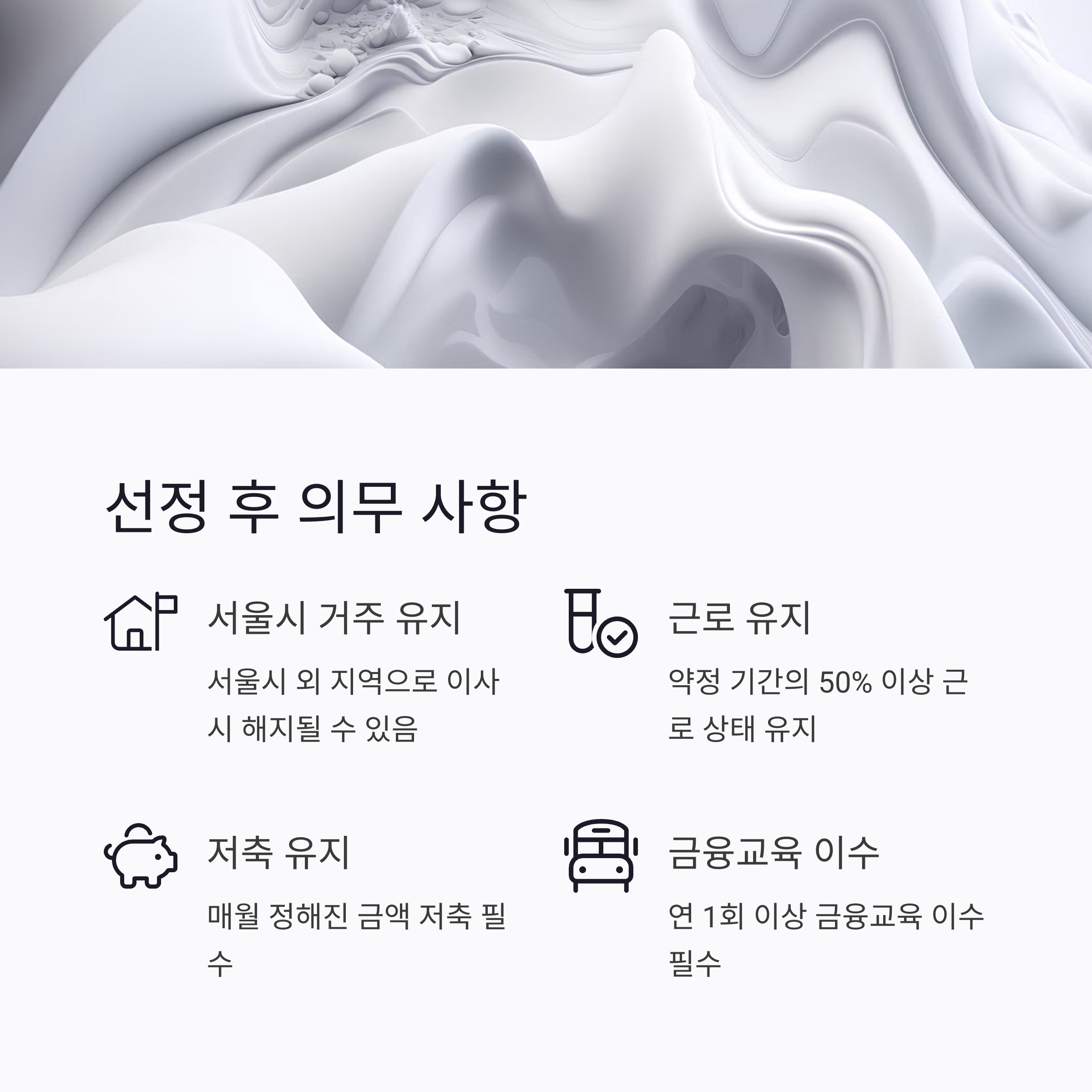 서울시 거주 유지, 꾸준한 근로 및 저축, 금융교육 이수가 필수예요.