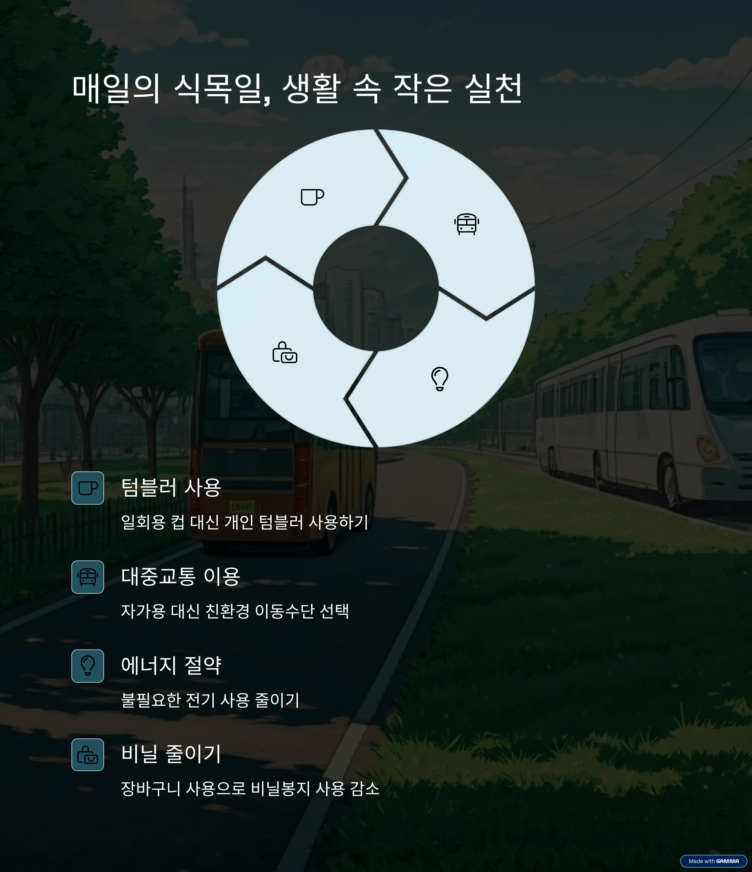텀블러 사용, 비닐 줄이기, 대중교통 이용, 에너지 절약 등