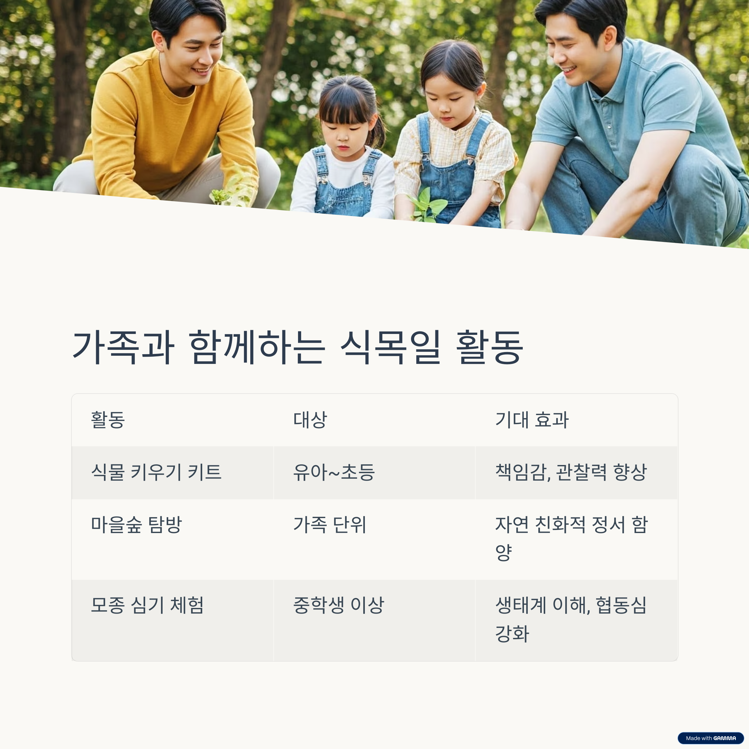 | 마을숲 탐방 | 가족 단위 | 자연 친화적 정서 함양 |
