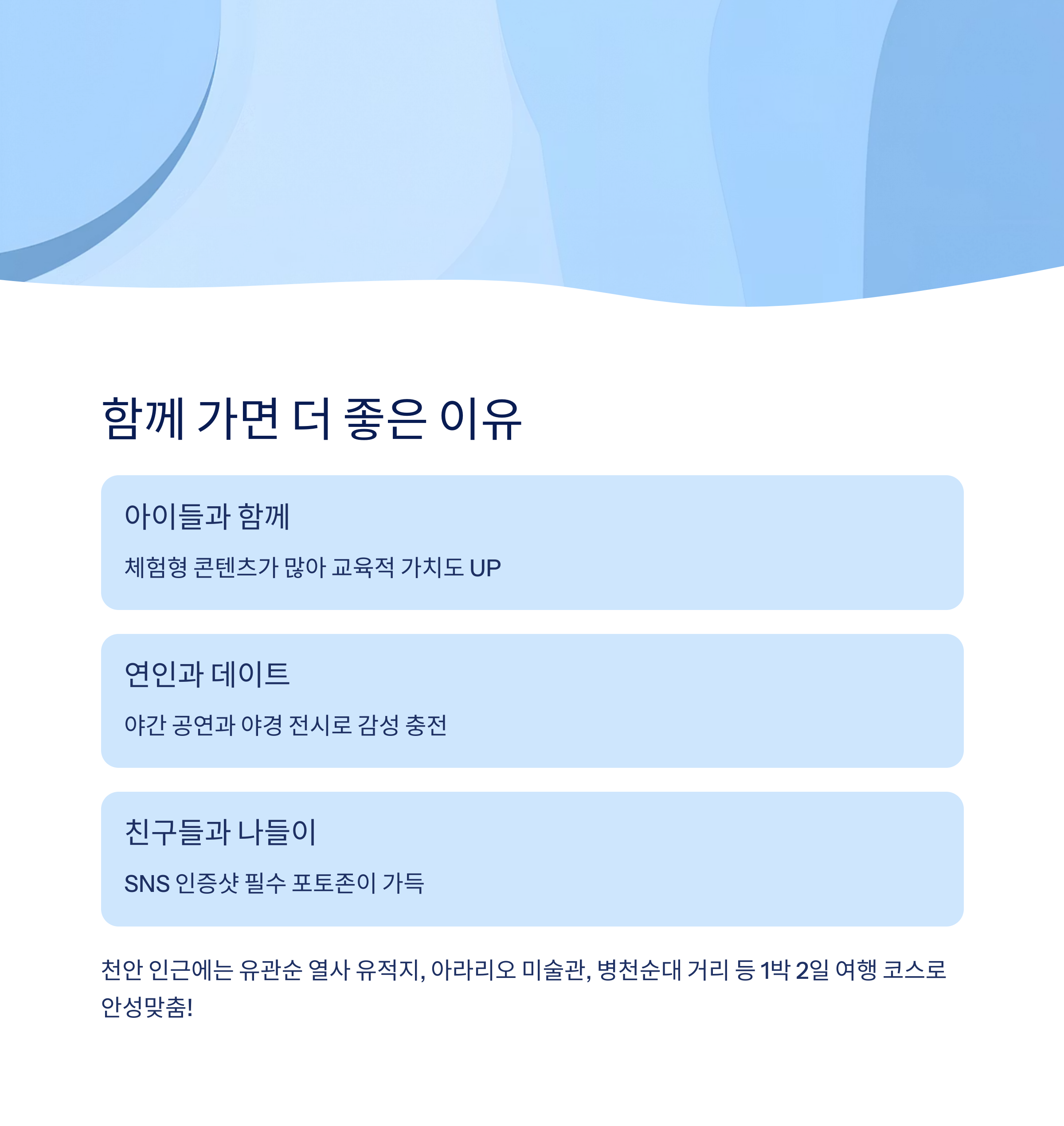 - 아이들과 함께: 체험형 콘텐츠가 많아 교육적 가치도 UP