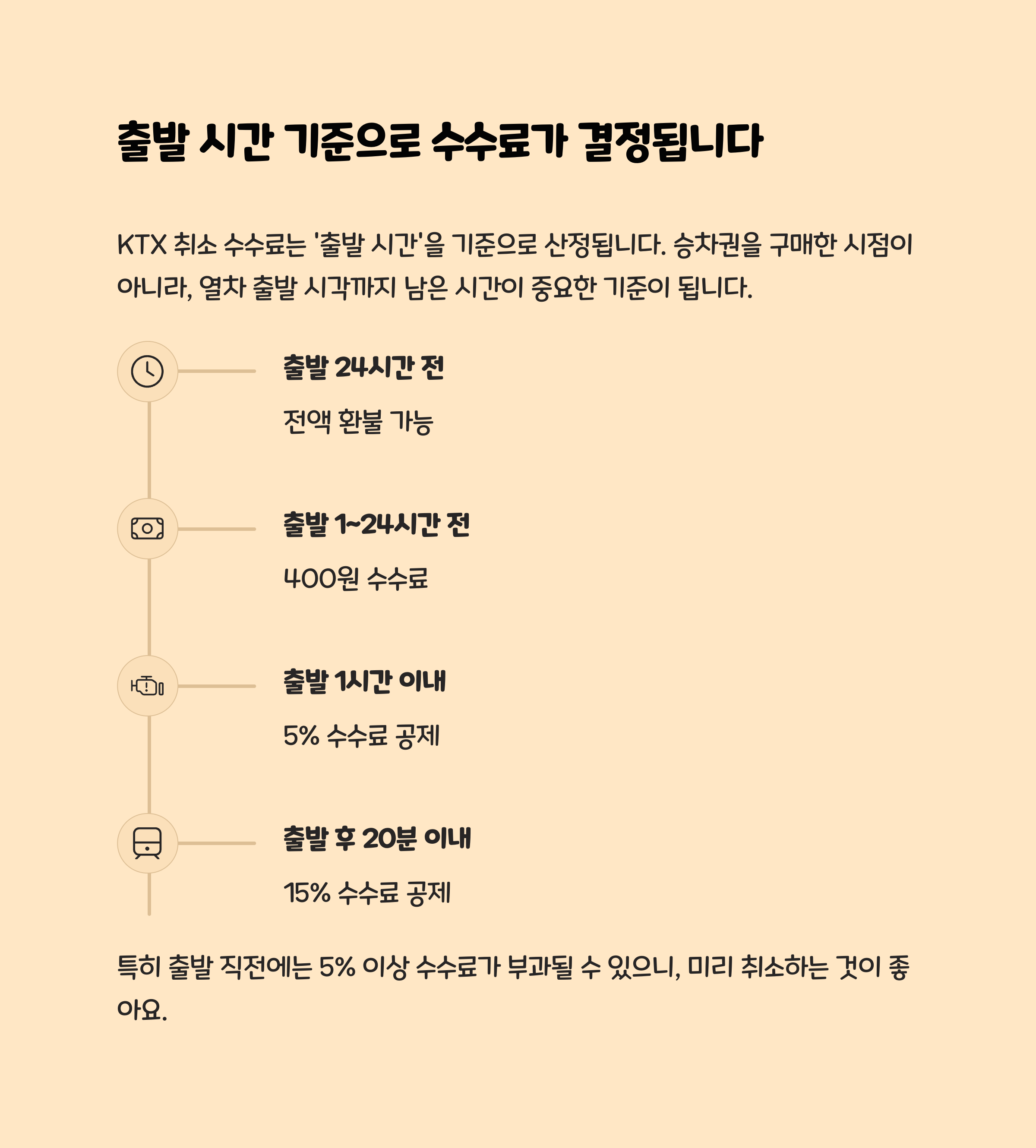 KTX 취소 수수료는 ‘출발 시간’을 기준으로 산정됩니다. 따라서 승차권을 구매한 시점이 아니라, 열차 출발 시각까지 남은 시간이 중요한 기준이 됩니다. 특히 출발 직전에는 5% 이상 수수료가 부과될 수 있으니, 미리 취소하는 것이 좋아요.