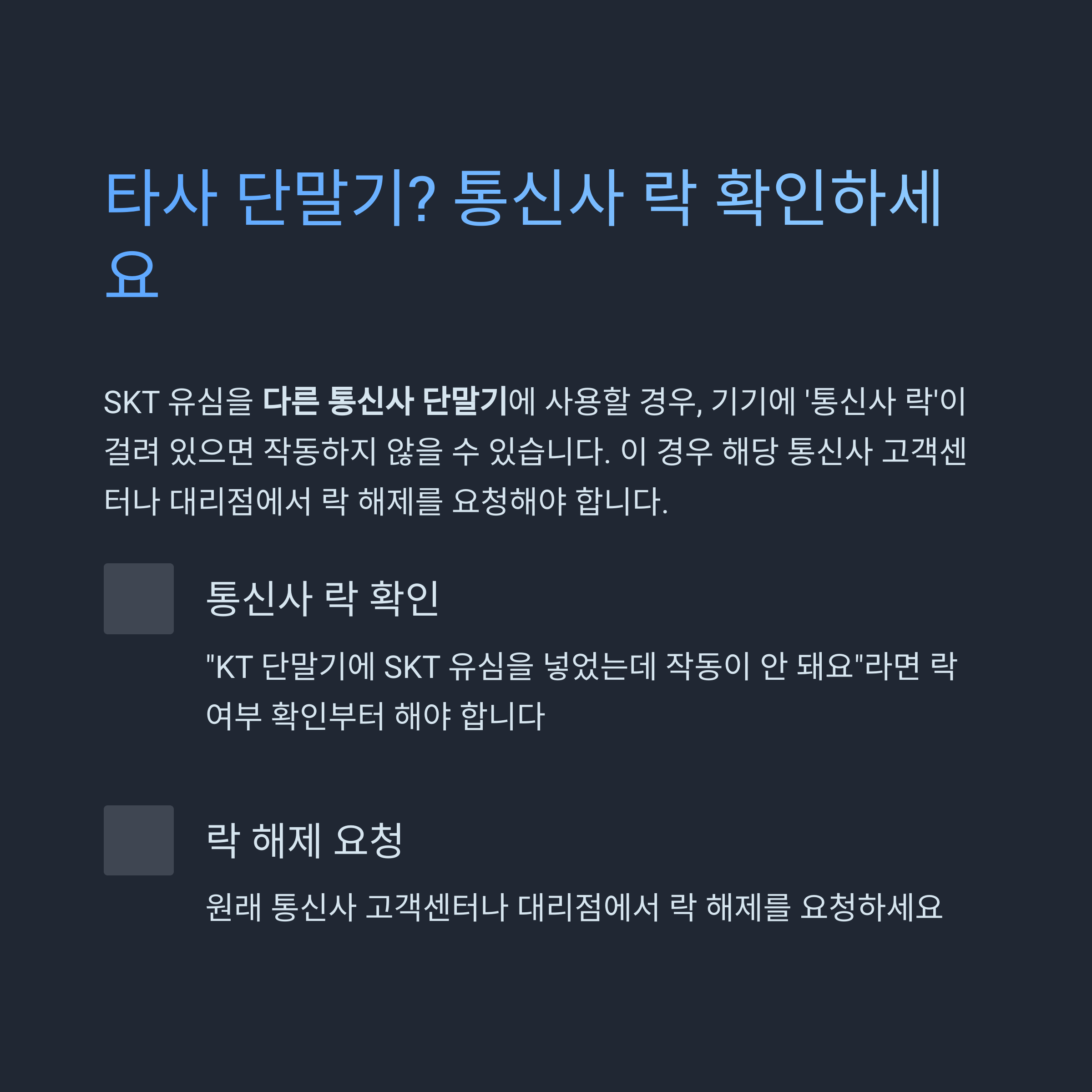 "KT 단말기에 SKT 유심을 넣었는데 작동이 안 돼요"라면 락 여부 확인부터 해야 합니다.